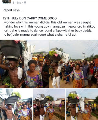 According to the Facebook user who shared the photos, the old woman pictured was caught having sex with her young lover in Amauzu Mkpoghoro, Afikpo North, Ebonyi State.