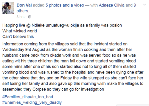 A family of 5 have died of food poisoning in Okija, Anambra state on Wednesday 9th of August. According to Facebook user, Don val who shared videos and photos from the scene, the man and his kids started vomiting blood as they ate from the food his wife prepared.
