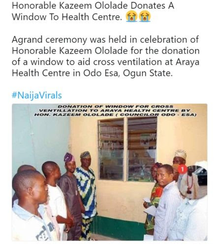 A grand ceremony was held in celebration of Honorable Kazeem Ololade for the donation of a window to aid cross ventilation at Araya Health Centre in Odo Esa, Ogun State. What do you think?